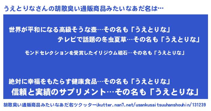 | 男性向けラノベタイトル風あだ名 | 『うえとりな~年齢イコール彼女いない歴の魔法使い~』 |