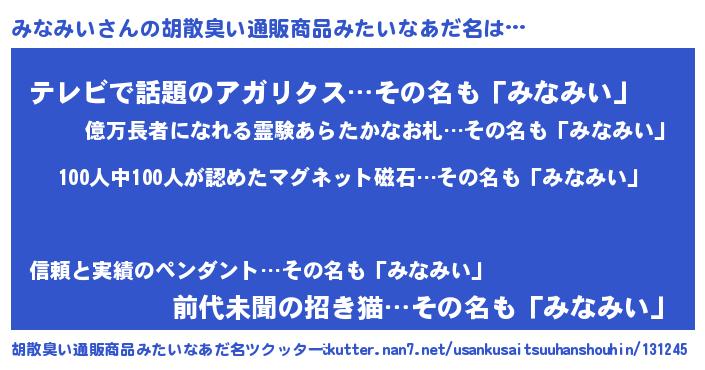 | ヘコむあだ名 | 『みなみい(小並感)』『みなもー』 |
