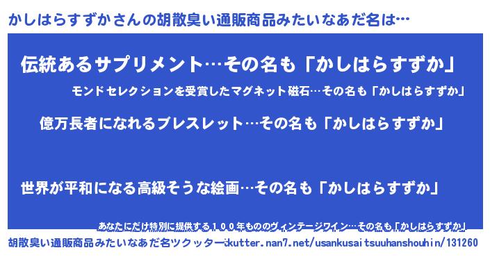 | ヒーロー風カッコイイあだ名 | 『スーパーカシハラスズカ』 |