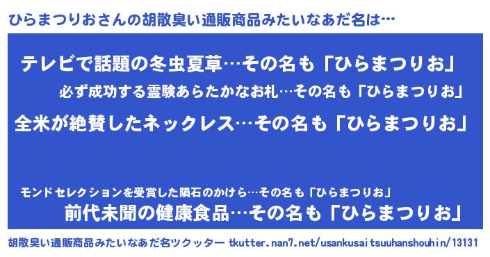 | 男性向けラノベタイトル風あだ名 | 『ひらまつりおに滅ぼされるだけの簡単なお仕事です』 |