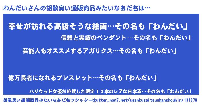 | 男性向けラノベタイトル風あだ名 | 『Re:わんだいから始める異世界生活』 |