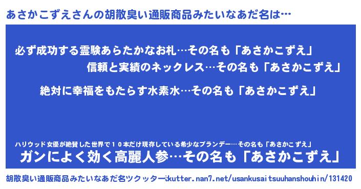 | 恥ずかしいあだ名 | 『あさちん』『プリティーあさかこずえ』 |