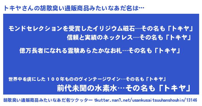 | 男性向けラノベタイトル風あだ名 | 『トキヤアートオンライン』 |