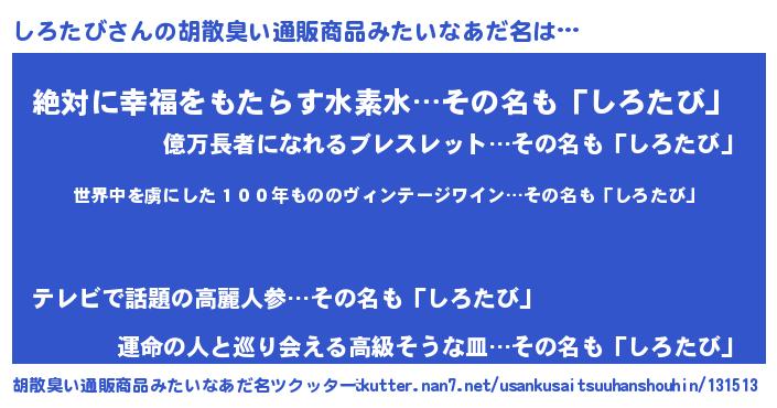 | ヘコむあだ名 | 『しろたび(笑)』『牛乳』『しろを』 |