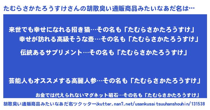 | 意味不明あだ名 | 『とにかく怪しいたむらさかたろうすけ』 |