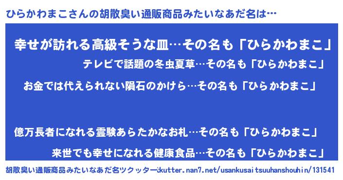 | 男性向けラノベタイトル風あだ名 | 『ノーゲーム・ノーヒラカワマコ』 |