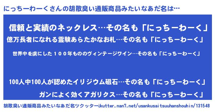| 意味不明あだ名 | 『住所不定無職にっちーわーく(11歳)』 |