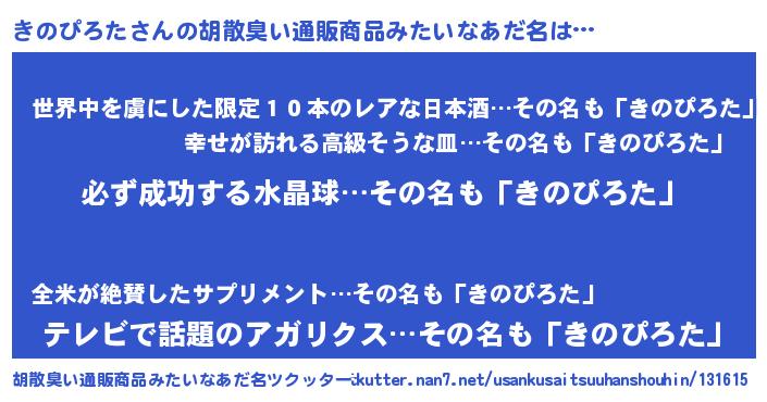 | 男性向けラノベタイトル風あだ名 | 『きのぴろたの憂鬱』『緋弾のキノピロタ』 |