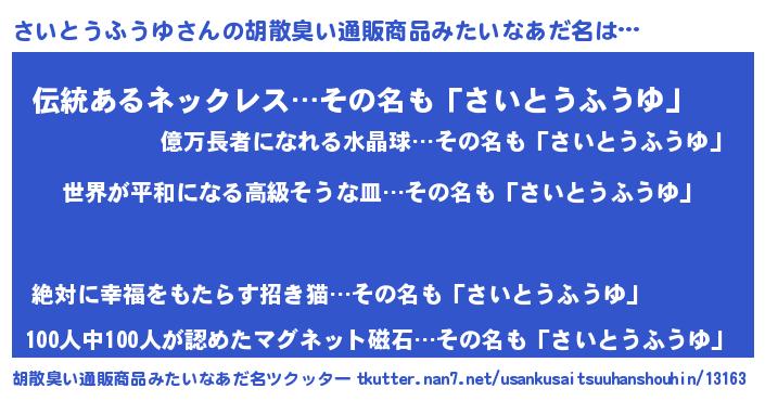 | 肩書あだ名 | 『さいとうふうゆ国家主席』 |