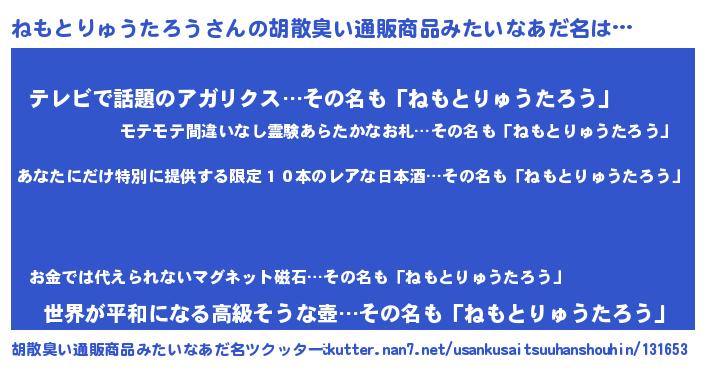 | 意味不明あだ名 | 『住所不定無職ねもとりゅうたろう(65歳)』 |