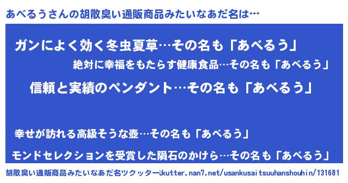 | 意味不明あだ名 | 『とにかく怪しいあべるう』 |