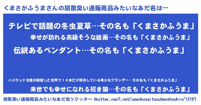 | 男性向けラノベタイトル風あだ名 | 『転生したらくまさかふうまだった件』 |