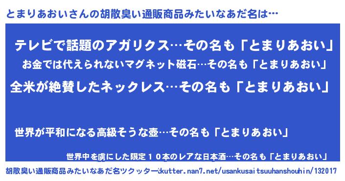 | 男性向けラノベタイトル風あだ名 | 『とまりあおいの嫁は女の子じゃないと思った?』 |
