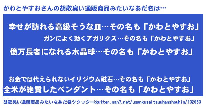 | ヒーロー風カッコイイあだ名 | 『スーパーカワトヤスオ』『魔戒騎士カワ』 |