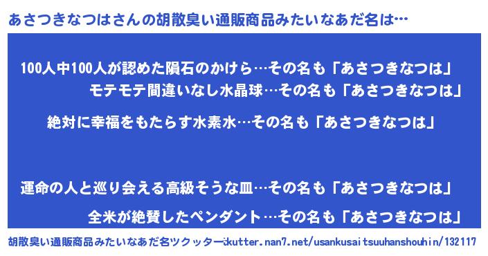 | ヘコむあだ名 | 『あさつきなつは(震え声)』『あさぷりん』 |