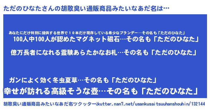 | 男性向けラノベタイトル風あだ名 | 『ただのひなた~年齢イコール彼女いない歴の魔法使い~』 |