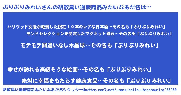 | ヘコむあだ名 | 『ぶりもー』『ぶりぶりみれい(笑)』 |