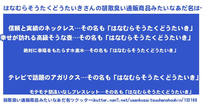 | ヘコむあだ名 | 『はなむらそうたくどうたいき(震え声)』 |