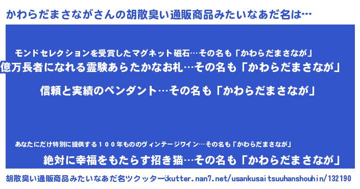 | ヘコむあだ名 | 『かわぷりん』『かわらだまさなが(苦笑)』 |