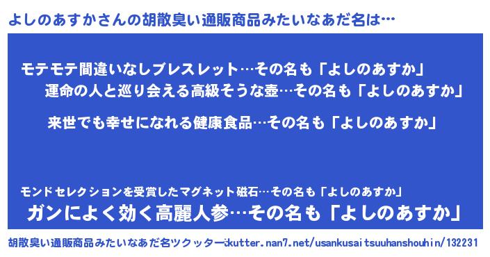| 恥ずかしいあだ名 | 『よしちん』『プリティーよしのあすか』 |