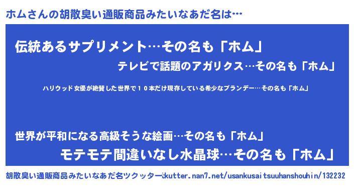 | 意味不明あだ名 | 『住所不定無職ホム(84歳)』『ペロリンホム』 |