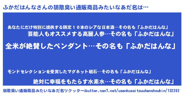 | 男性向けラノベタイトル風あだ名 | 『ふかだはんな~年齢イコール彼女いない歴の魔法使い~』 |