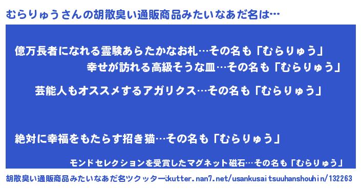 | 男性向けラノベタイトル風あだ名 | 『Re:むらりゅうから始める異世界生活』 |