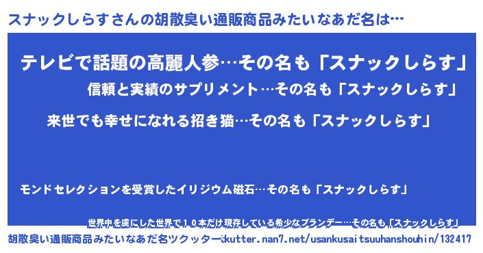 | 意味不明あだ名 | 『永久保存スナックしらす』 |