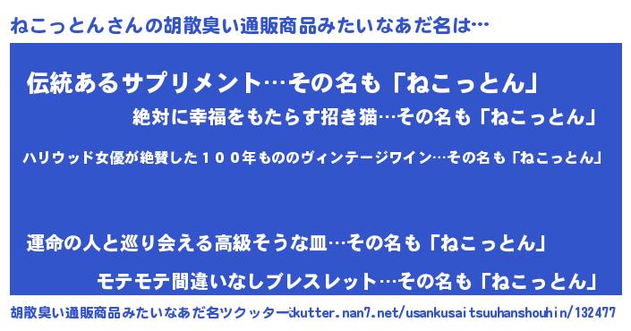 | 男性向けラノベタイトル風あだ名 | 『魔弾の王とねこっとん』 |