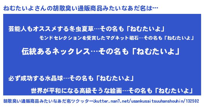 | ヘコむあだ名 | 『ねむ太郎』『酢こんぶ』『ねむにー』 |