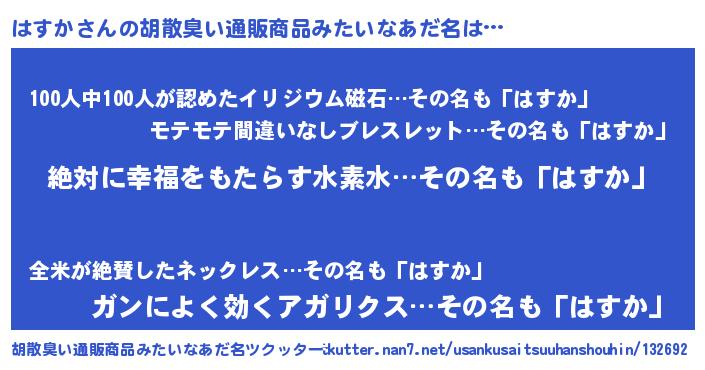 | 意味不明あだ名 | 『しいたけ科はすか属』『永久保存はすか』 |