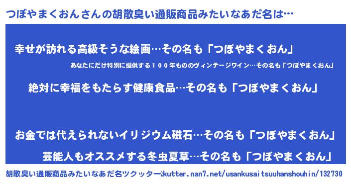 | 男性向けラノベタイトル風あだ名 | 『つぼやまくおんという概念が存在しない退屈な世界 』 |