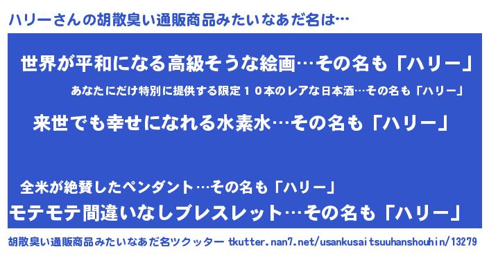 | 男性向けラノベタイトル風あだ名 | 『転生したらハリーだった件』 |