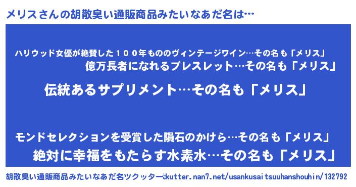 | ヘコむあだ名 | 『メリお』『メリス(笑)』『レバニラ』 |