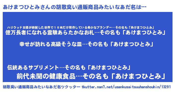 | 男性向けラノベタイトル風あだ名 | 『アケマツヒトミスレイヤー』 |