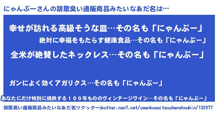| 男性向けラノベタイトル風あだ名 | 『にゃんぷーの嫁は女の子じゃないと思った?』 |