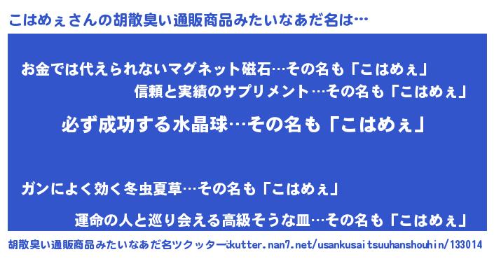 | ヘコむあだ名 | 『こはふぇ~』『酢こんぶ』『こはを』 |