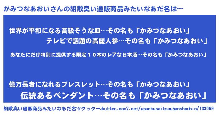 | 男性向けラノベタイトル風あだ名 | 『かみつなあおいに滅ぼされるだけの簡単なお仕事です』 |