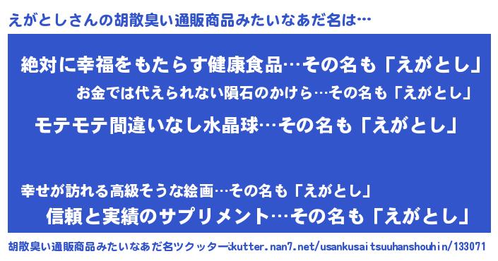 | 意味不明あだ名 | 『ペロリンえがとし』『永久保存えがとし』 |
