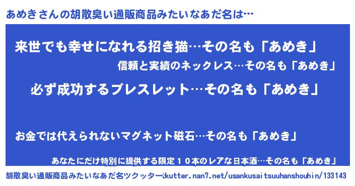 | 男性向けラノベタイトル風あだ名 | 『緋弾のアメキ』『はたらくあめきさま!』 |