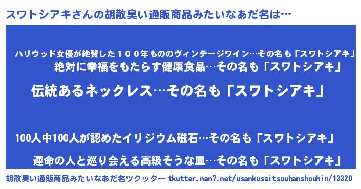 | 男性向けラノベタイトル風あだ名 | 『転生したらスワトシアキだった件』 |