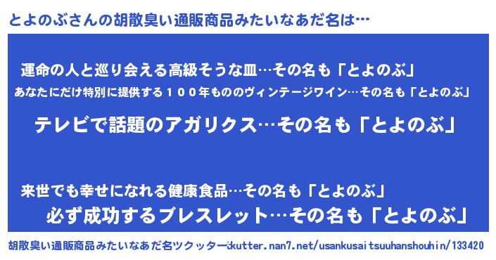 | 意味不明あだ名 | 『なめこ科とよのぶ属』『自称とよのぶ』 |