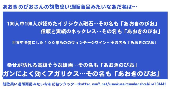 | 意味不明あだ名 | 『住所不定無職あおきのぴお(9歳)』 |