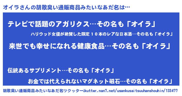 | 女子向けラノベタイトル風あだ名 | 『オイラの契約王妃』『オイラ恋絵巻』 |