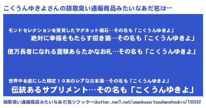 | 男性向けラノベタイトル風あだ名 | 『コクウンユキヨアートオンライン』 |