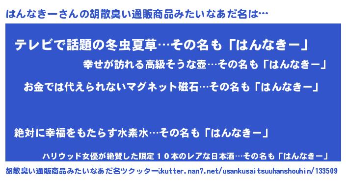 | 男性向けラノベタイトル風あだ名 | 『転生したらはんなきーだった件』 |
