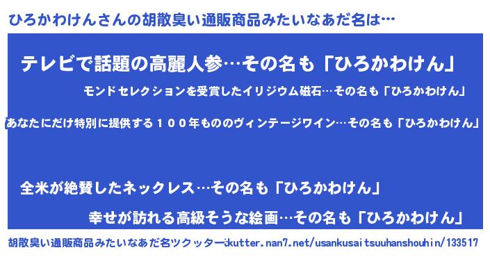 | 女子向けラノベタイトル風あだ名 | 『悪役ひろかわけんに転生したようですが、知った事ではありません』 |
