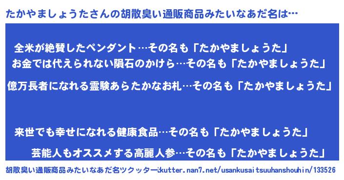 | 男性向けラノベタイトル風あだ名 | 『うちのたかやましょうたが世界を掌握している!』 |
