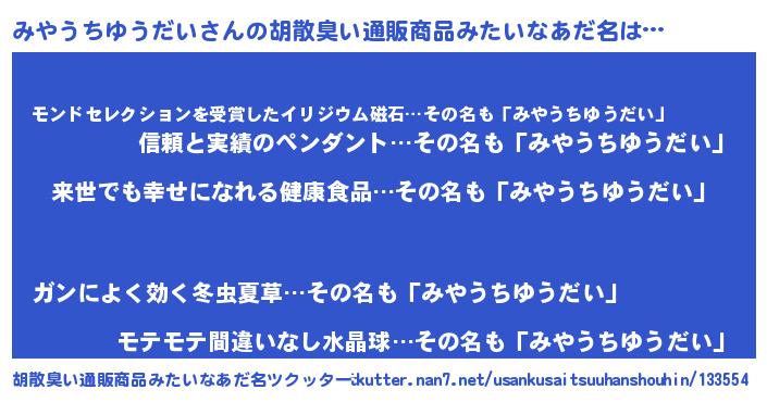 | ヘコむあだ名 | 『みやうちゆうだい(笑)』『みやもー』 |