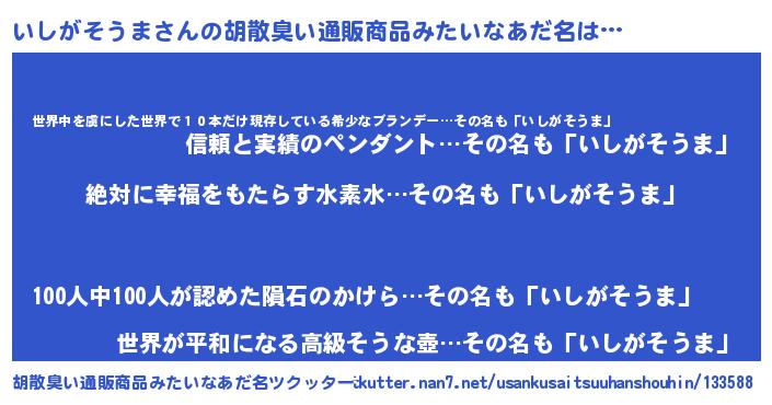 | 男性向けラノベタイトル風あだ名 | 『いしがそうまという概念が存在しない退屈な世界 』 |